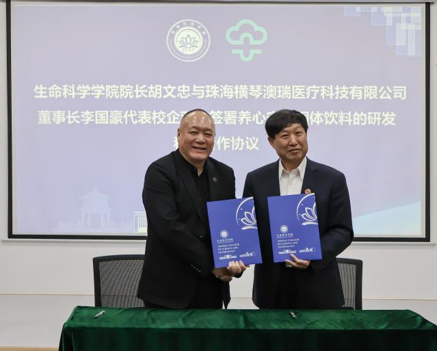 副校长程春梅与董事长李国豪代表校企双方签署产学研实习基地、联合共建琴澳生命健康研究院合作协议