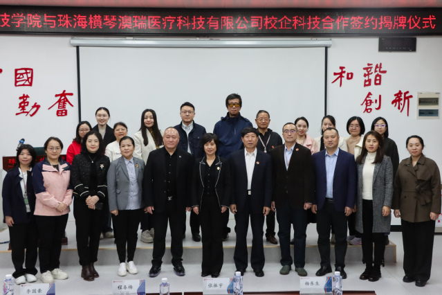 2024年12月18日,珠海科技学院与珠海横琴澳瑞医疗科技有限公司联合共建琴澳生命健康研究院、产学研基地及校企科技合作签约揭牌仪式在学校敏学楼202举行。学校党委委员、副校长程春梅,珠海横琴澳瑞医疗科技有限公司董事长李国豪、行政副总经理史晓杰、服务中心主任孔青,大健康产业学院院长胡文忠、科研处副处长张振宇、生命科学学院领导班子及师生代表参加仪式。胡文忠教授主持签约揭牌仪式。